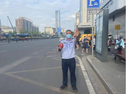 工作時,王軍全神貫注,每天準時守候在公交站臺,竭盡全力服務(wù)好每一位乘客。下午4、5點的站臺上,一股股熱浪從路面騰起,炙熱的陽光照在身上猶如蒸籠一般,站臺上的王軍仍堅持仔細檢查每一位乘客的“兩碼”。