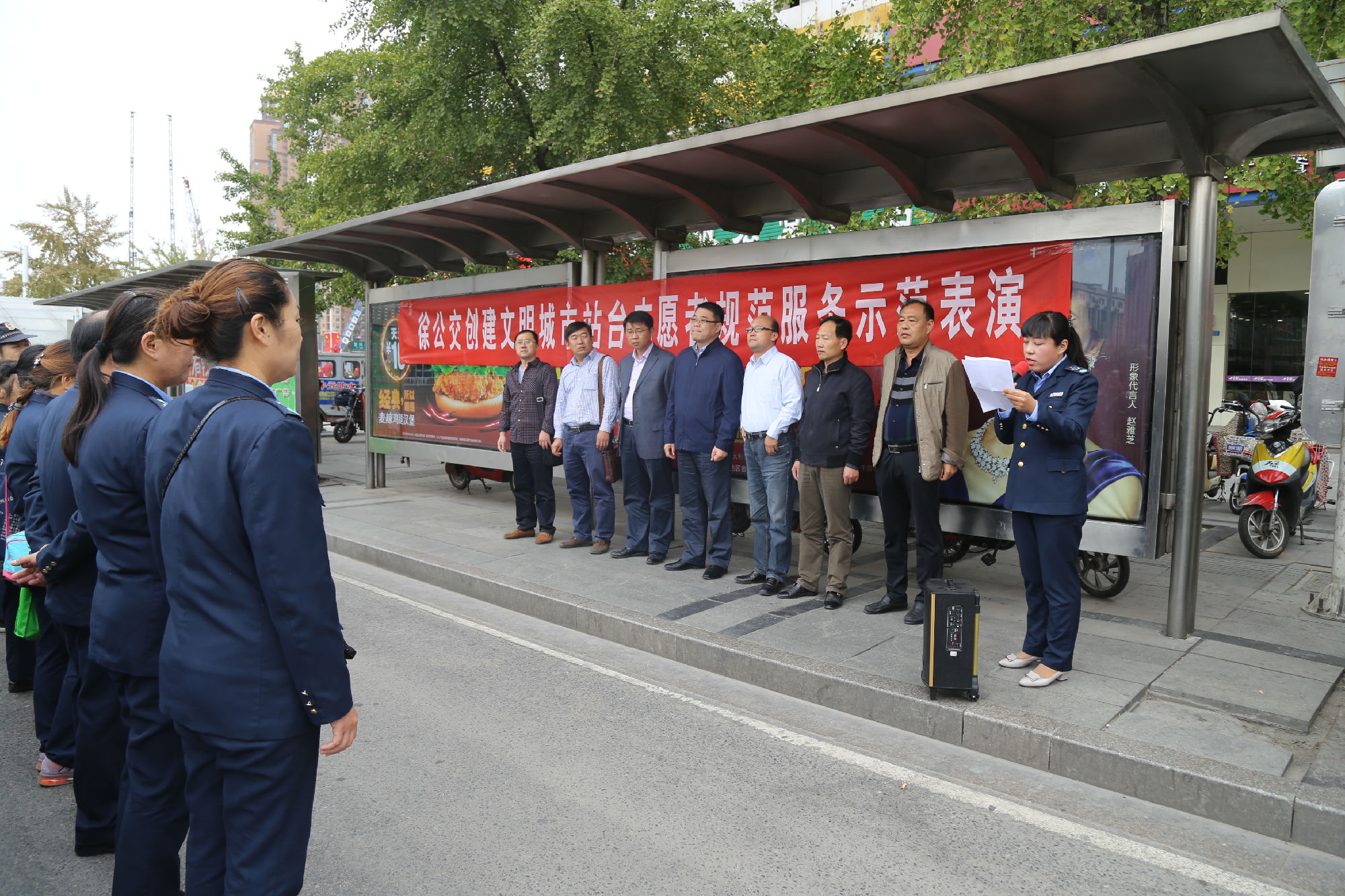 為進(jìn)一步規(guī)范站臺(tái)服務(wù)引導(dǎo)工作,不斷推動(dòng)文明城市創(chuàng)建順利進(jìn)行,109日上午,公司在徐州站主廣場舉行了一次公交站臺(tái)秩序規(guī)范服務(wù)示范表演。團(tuán)市委副書記夏友峰、運(yùn)管處客運(yùn)科科長陳福升、以及市創(chuàng)建辦交通秩序二組三位領(lǐng)導(dǎo)蒞臨觀摩。服務(wù)督導(dǎo)隊(duì)34名站臺(tái)志愿者參加了示范表演。