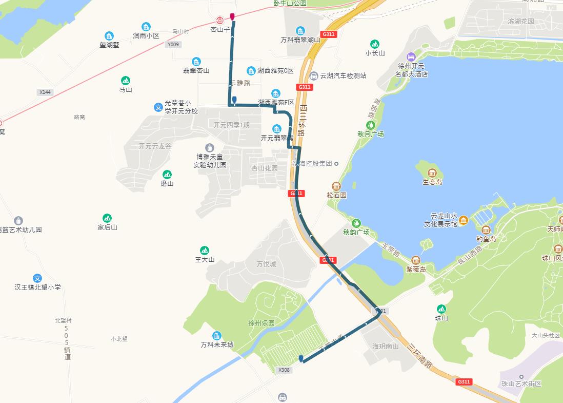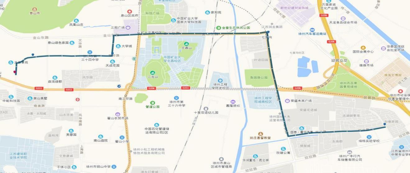 線路站點(diǎn):御景灣公交首末站、濱湖御景灣南門、姚莊街坊中心、欣欣路口、七里溝地鐵站、礦大北門、大學(xué)城、天成花園、三十四中、三十中附小、泉泰嘉苑、泉山美墅西門(路西,單向)、碧水灣小區(qū)(路北、單向)、泉山法院(路南,單向)。備注:因目前雙山路與三環(huán)南路交叉口正在施工,公交車輛無法通行,319路暫時(shí)僅運(yùn)行至泉泰嘉苑。待道路貫通后,進(jìn)行全線路運(yùn)營(yíng)。