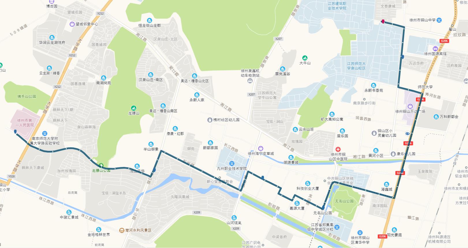 線路站點(diǎn):建筑學(xué)院、江蘇師范大學(xué)、師范大學(xué)地鐵站、萬科新都會(huì)、港鑫城、南洋國(guó)際、康樂園南門、無名山公園地鐵站、銅山區(qū)政府、楚河金茂府、嵩山路、銅山新區(qū)總站、久隆鳳凰城北門、保利迎賓館、龍腰山公園、泉山森林海、第一人民醫(yī)院南門。