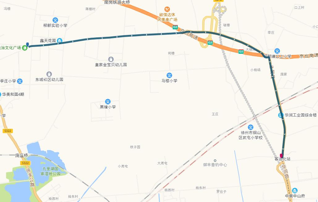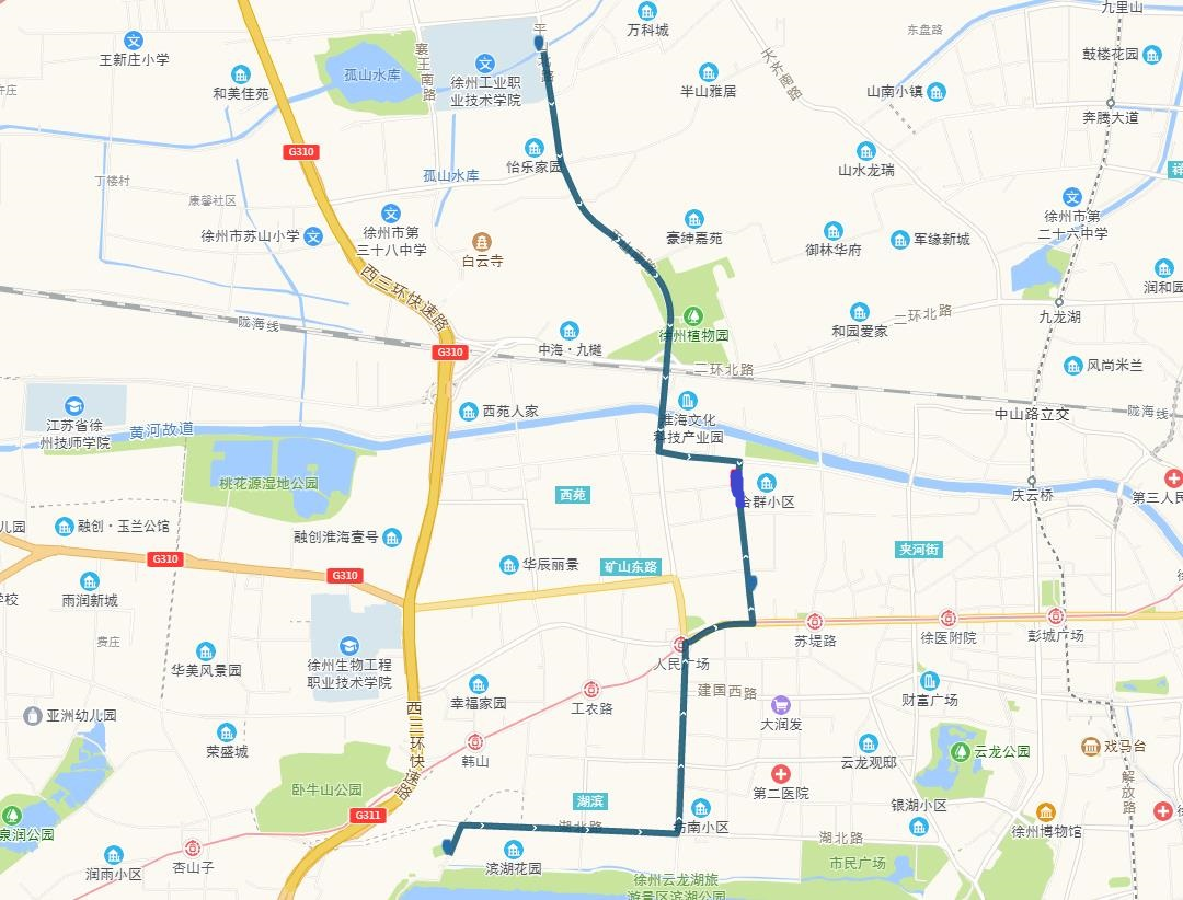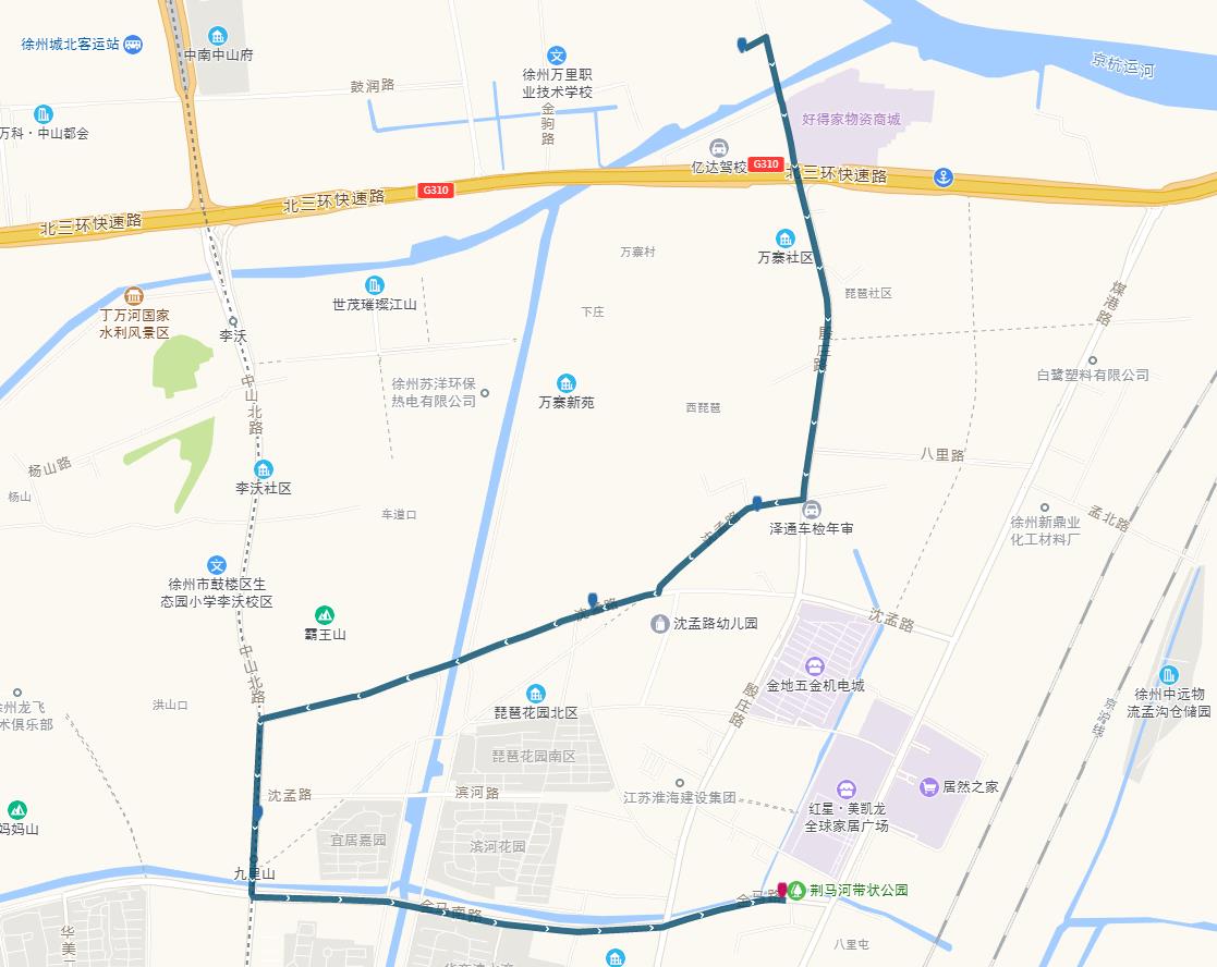 線路站點(diǎn):山南小鎮(zhèn),山水龍瑞,馬場(chǎng)湖路口,馬場(chǎng)湖,怡康花園,后勤學(xué)院北,誠坤鋼材市場(chǎng),蘇堤北路立交橋(西),蘇堤北路立交橋(東),蘇堤路小學(xué),永業(yè)花園小區(qū),江蘇四監(jiān),銅沛路東口,中山北路立交橋