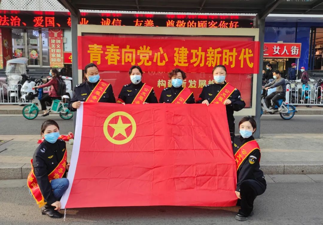 在建團100周年之際,服務(wù)督導(dǎo)隊黨支部組織黨員、青年團員以黨帶群團方式,走進公交站臺開展青年心向黨 建功新時代志愿服務(wù)活動。
