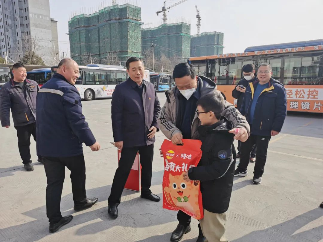 1月22日農歷大年初一,在城北公司韓山首末站、新區(qū)公司建筑學院首末站等場站調度室,曹震與堅守崗位的一線員工一一握手,叮囑他們加強個人防護,注意安全駕駛、確保車場安全,對他們放棄與家人團聚、堅守一線的敬業(yè)精神表示感謝,并向其致以節(jié)日的慰問,送上了節(jié)日慰問品。